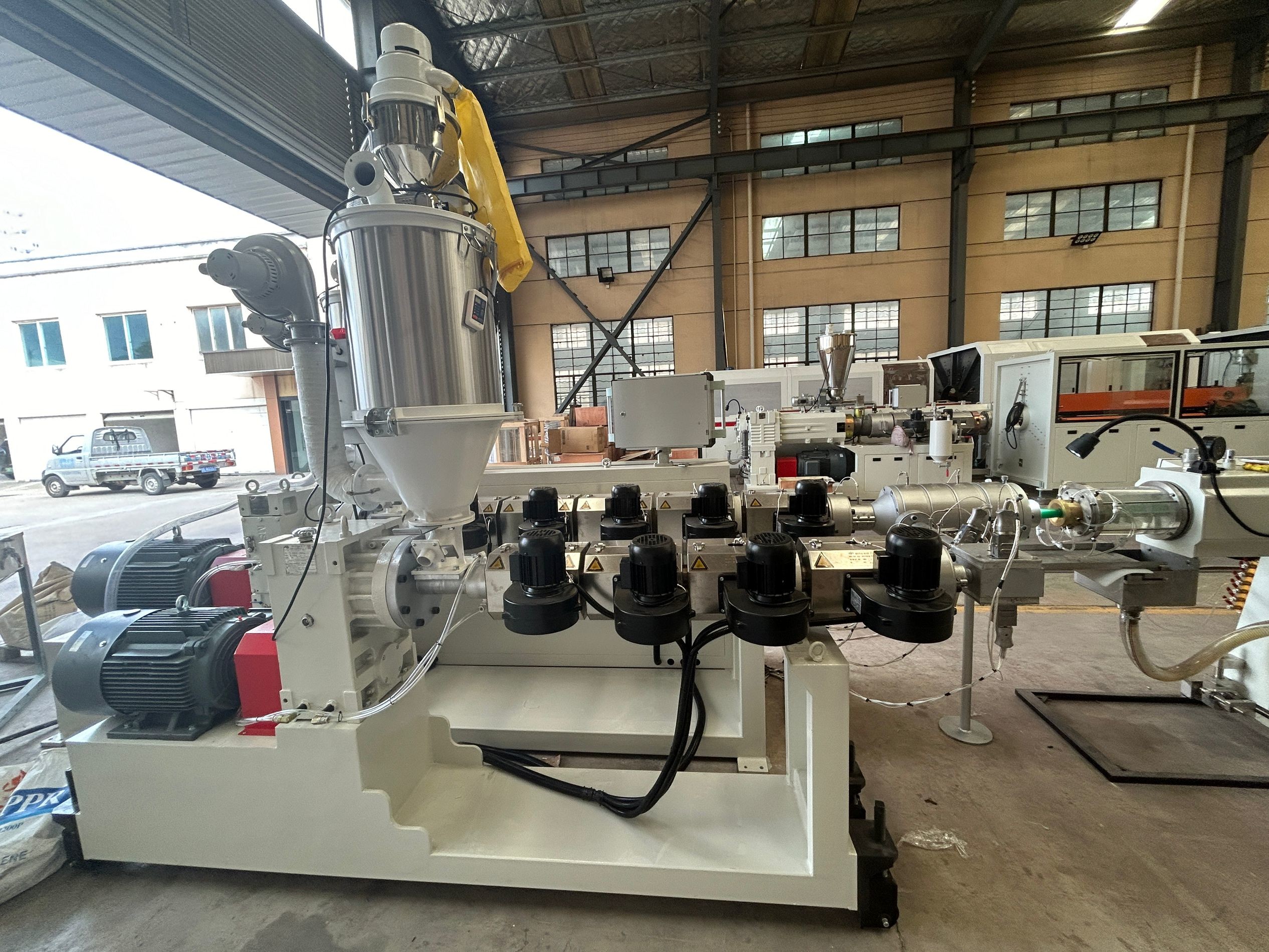 Οι πρώτες ύλες (σφαιρίδια PPR/PVC, πρόσθετα) τροφοδοτούνται αυτόματα στην θήκη και αναμιγνύονται ομοιόμορφα.
