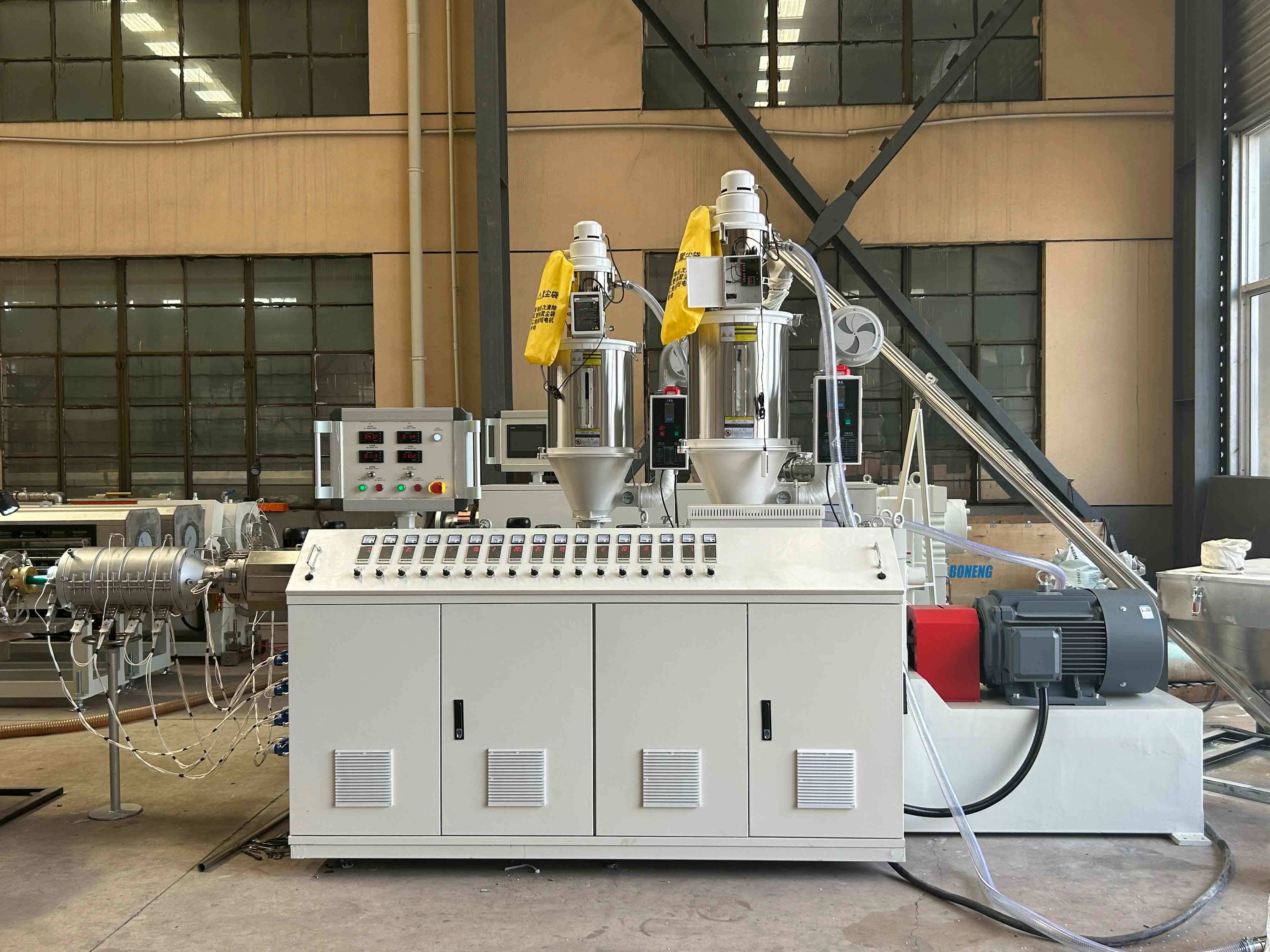 Οι πρώτες ύλες (κόκκοι PPR/PVC, πρόσθετα) τροφοδοτούνται αυτόματα στη χοάνη και αναμιγνύονται ομοιόμορφα.