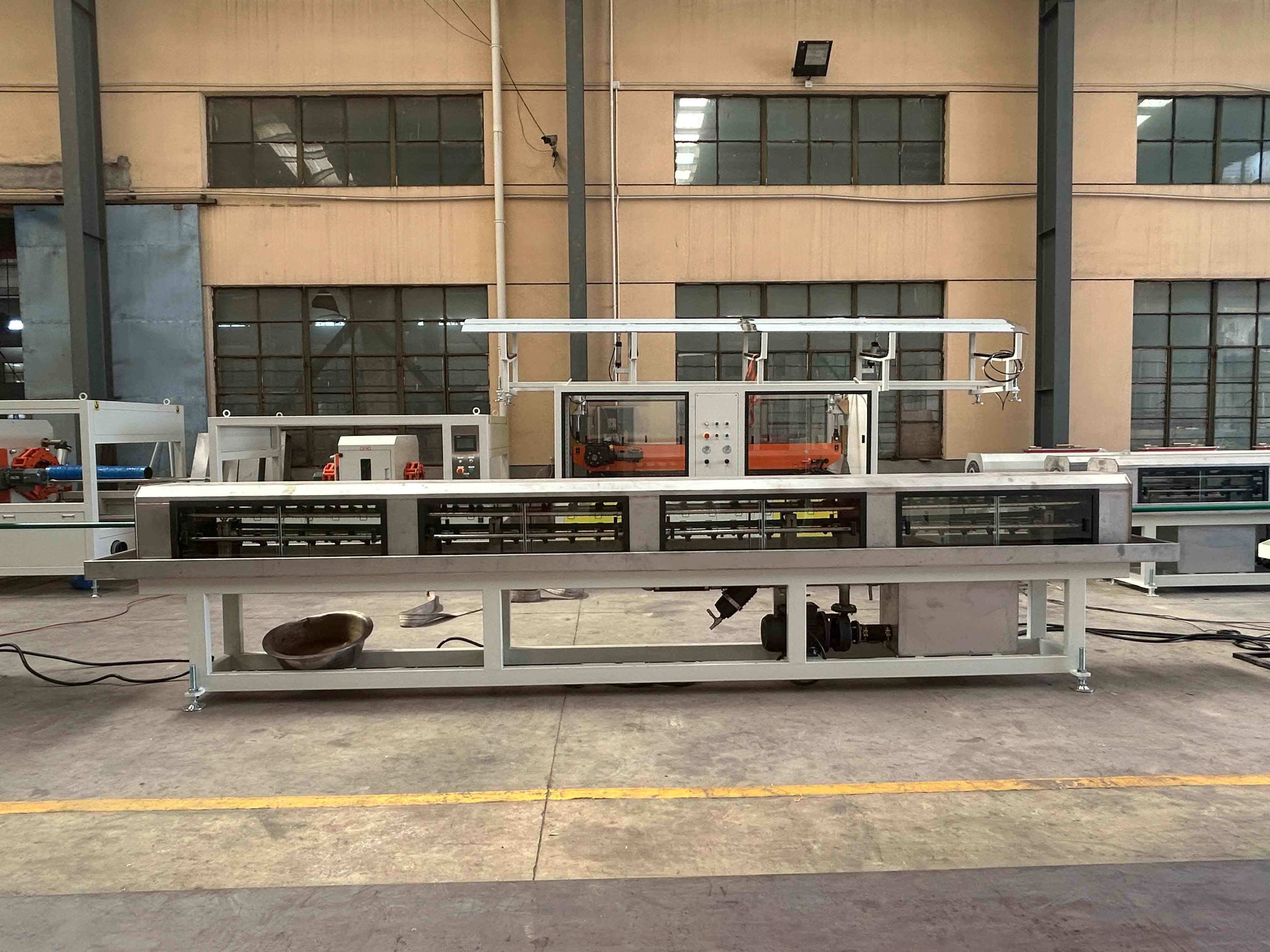 Το λιωμένο πλαστικό περνά μέσα από μια κεφαλή μήτρας για να σχηματίσει σωλήνες/προφίλ, στη συνέχεια εισέρχεται σε μια δεξαμενή βαθμονόμησης κενού για ακριβή διαμόρφωση και ψύξη.