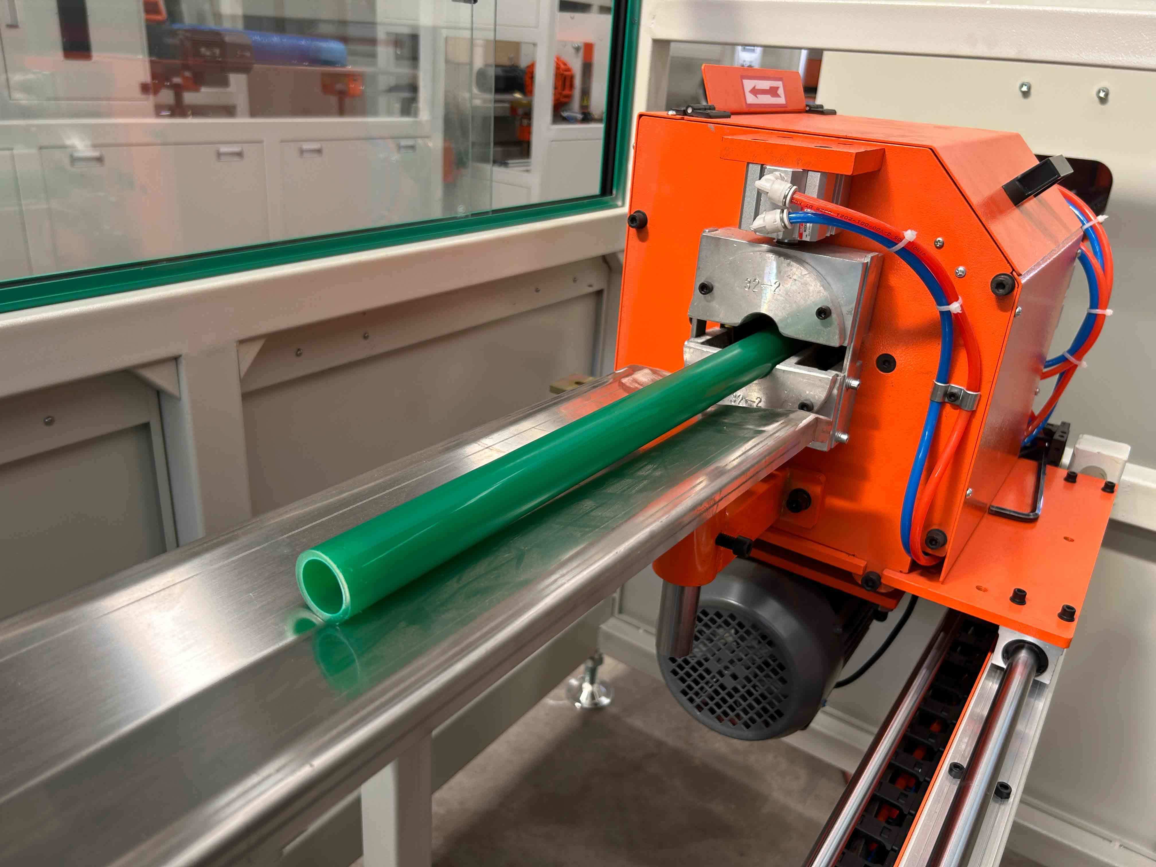 Μια αυτόματη μηχανή κοπής κόβει τον σωλήνα στα απαιτούμενα μήκη.