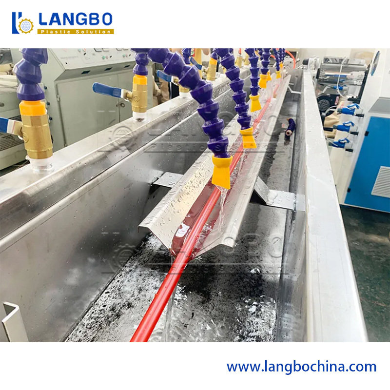 Η δεξαμενή νερού τεσσάρων μέτρων εξασφαλίζει την ψύξη και τη διαμόρφωση του παραγόμενου σωλήνα με ψεκασμό κρύου νερού.