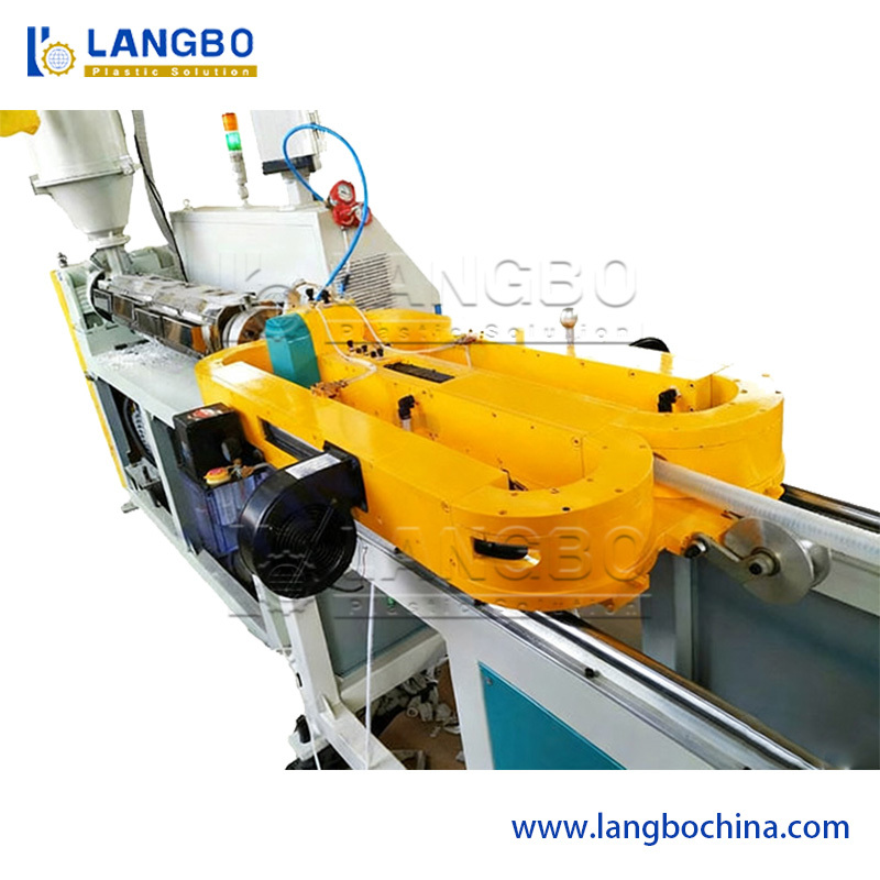 Οι πλαστικοί κόκκοι τροφοδοτούνται στην θήκη και λιώνουν στην εκχύλισσα υπό ελεγχόμενη θερμοκρασία και πίεση.Το λιωμένο υλικό στη συνέχεια διαμορφώνεται στο καλούπι κυματοποίησης με κενό ή σχηματισμό πίεσηςΜετά το σχήμα, οι κυματοειδείς σωλήνες ψύχονται με νερό για να σταθεροποιήσουν το σχήμα τους.